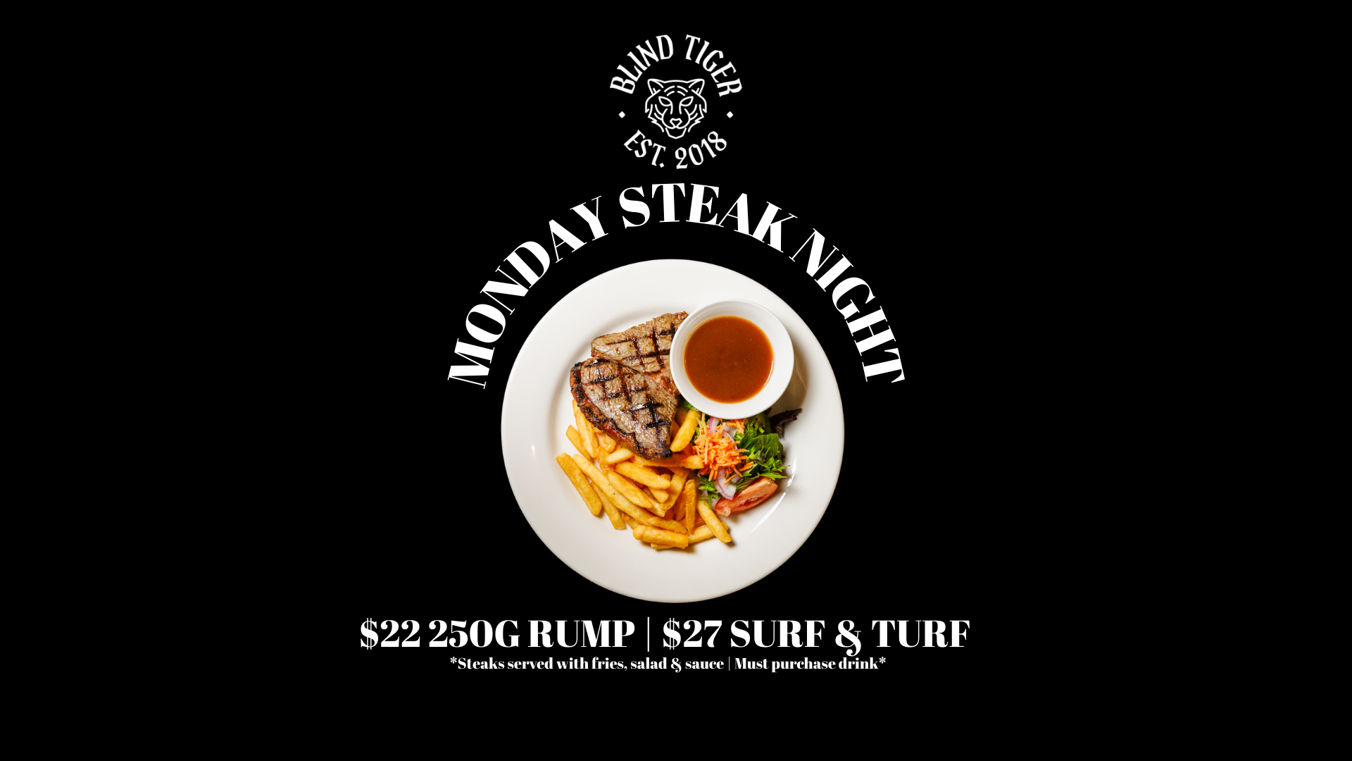 Monday nights are all about steaks done right, with your pick of a 250g rump for $22 or a surf and turf for $27.